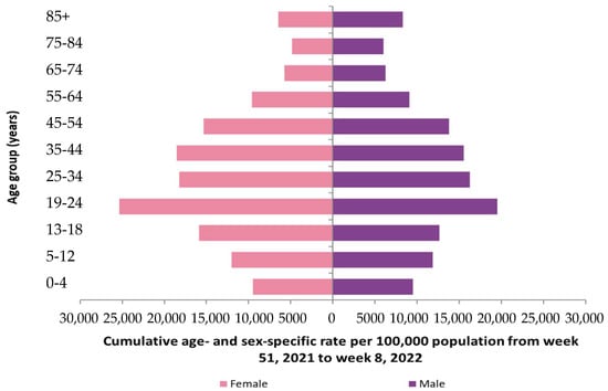Cumulative age and sex-specific incidence rates of confirmed COVID-19 cases per 100,000 population notified in Ireland between week 51 in 2021 and week 8 in 2022 (after []).