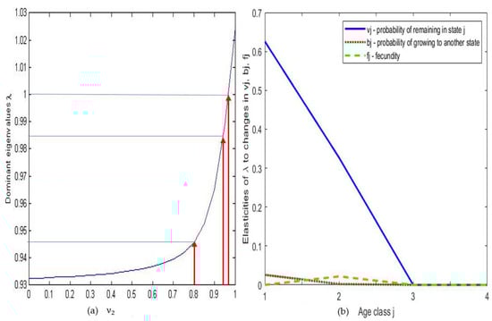 The dominant eigenvalue of E is equal to 0.9847, if = 0.94, and 0.9467, if = 0.8. Using the method proposed in [], Figure 6a shows dominant eigenvalues while varying value of probability of remaining in second age class (20–39): when is greater than 0.96, the dominant eigenvalue is greater than 1 and the population of observed COVID-19 cases exhibits an exponential growth. The second age class is the only class having a large effect on the population growth, because others have no birth rate.