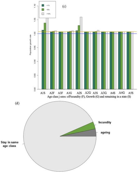 - Cashwell, H. A General Formular for the Sensitivity of Population Growth rate to Changes in Life History. Theor. Popul. Biol. 1978, 14, 215–230. [Google Scholar] [CrossRef]