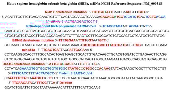 Complete fetal human hemoglobin beta (HBB) subunit mRNA sequence potentially targeted by SARS-CoV-2 gene fragments, those from RNA-dependent RNA polymerase (also targeted by the ßA siRNA in violet [,]) and from protein S (in blue), and by the human miR hsa miR 451a (in red). Moreover, shown (in red) are fragments containing deletions of protein S in its N-terminal domain and mutations N501Y, E484K and D614G (base mutated in green). The probability of a hybridization by chance of length 8 in red (resp. 10), for 624 nucleotides, is equal to 0.04 (resp. 0.005), hybridizations TG and GT counting for ½.