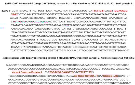 Another origin of specific ageing comes from the hybridization of the mRNA of proteins involved in vital metabolisms. In search of hybridization germs, we have inspected viral RNA sequences from different databases [,,], using the classic BLAST software. For example, we have already noticed in a previous work [] that miR 129-5p was a known inhibitor of the biosynthesis of gamma-globin 2, a subunit of human fetal hemoglobin, replaced in adults by beta-globin, also dysregulated in some blood diseases, like the other subunit alpha-globin, by several miRs, including miR 451a [,,,,]. The search for hybridization germs having the same inhibition potential as that of miRs 129-5p and 451a has led to the identification of two subsequences of RNA-dependent RNA polymerase and S genes of SARS-CoV-2. Figure 7 shows these subsequences identified as inhibitors of the biosynthesis of human beta-globin, and Figure 8 shows two hybridizations of parts of human interferon mRNA and anti-aging Gaf1 protein mRNA by subsequences from S protein gene of Omicron variant of SARS-CoV-2 [].
