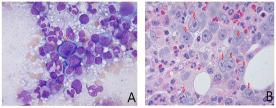Images from the patient’s bone marrow biopsy samples: (A) Bone marrow aspirate. Arrow shows a proerythroblast with possible viral inclusion (difficult to distinguish from unusually large nucleoli). (B) Bone marrow trephine: Erythroid cells (arrows) are decreased in number and severely left-shifted with nearly complete arrest at the pro-erythroblast stage.