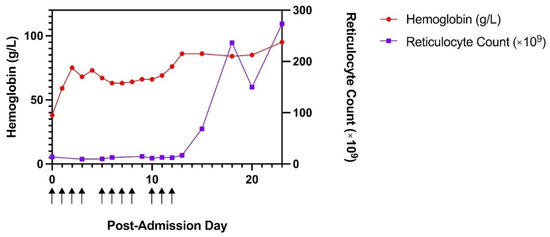 A graph of the patient’s hemoglobin and reticulocyte count over time: The patient’s hemoglobin (g/L) and reticulocyte count (×109) charted over time, as defined by days post-admission to hospital on 10 April 2021. Arrows under the x-axis indicate days on which the patient received one or more blood transfusions.