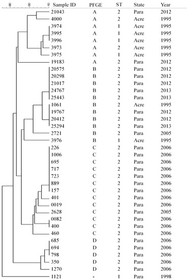 The PFGE typing revealed a higher genetic diversity of S. Typhi strains, with the presence of 20 distinct pulsotypes, and clonally related isolates causing infection in different locations and periods, also supporting the hypothesis of a localized and restricted clonal expansion [10,11]. Such results are different from those reported by Tiba-Casas et al. [16] evaluating isolates from São Paulo, Brazil, which described a genetic background mostly composed of two main clonal clusters. Interestingly, strains ST1 and ST2, belonging to clusters A and B from Acre/1995, were related to an outbreak that occurred in the city of Tarauacá/Acre State and was detected after 17 years causing infection in the city of Belém/Pará State (subclusters A1 and B2). Strains 1006, 695, 717, 723, 889, 401, 0082, 400, and 460, included in cluster C, were related to an outbreak that occurred in 2006 in the Guamá neighborhood, Belém/Pará; the other strains from the same period and cluster were from epidemiologically unrelated sporadic cases, even though such strains present a certain level of genetic relatedness. The strains belonging to clusters B and D, recovered in 2006, 2012, and 2013, were from epidemiologically unrelated sporadic cases.