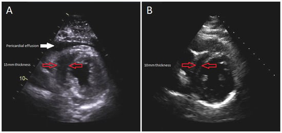 Parasternal short-axis view of TTE: (A) during the acute illness revealing 15 mm LV wall thickness; (B) 1-month follow-up demonstrating 10 mm LV wall thickness.