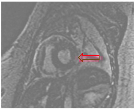 Gadolinium enhanced cardiac MRI pointing to the patchy sub-epicardial delayed enhancement of the basal lateral/inferolateral wall (red arrow).