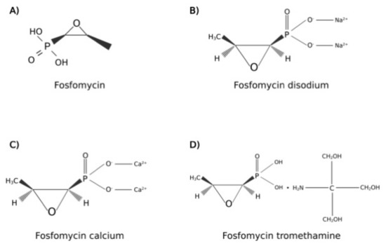 The molecular structure of fosfomycin (Figure 1) differs in consideration of drug formulation, indeed, it is available in two oral formulations, fosfomycin calcium and fosfomycin trometamol (also known as fosfomycin tromethamine); this latter is a soluble salt with better bioavailability than fosfomycin calcium. Moreover, an intravenous formulation, fosfomycin disodium, is also commercialized for diverse clinical uses, different from the scope of this review [14].