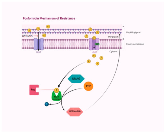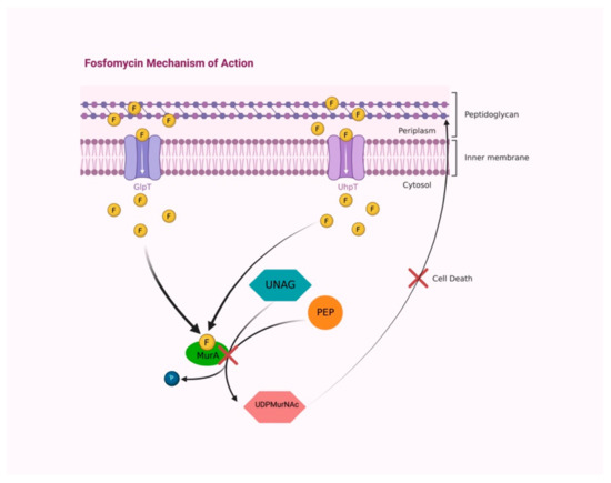 Fosfomycin accesses into the bacterial wall by two transport uptake systems, GlpT and UhpT. In the cytoplasm, fosfomycin covalently binds to the active site of MurA enzyme, preventing the reaction between PEP and UNAG and avoiding UDPMurNAc synthesis, resulting in peptidoglycan building interruption and causing bacterial-cell death. Abbreviations: F, fosfomycin; GlpT, L-alpha- glycerophosphate transport system; UhpT, hexose-6-phosphate transport system; PEP, phosphoenolpyruvate; UNAG, UDP-N-acetylglucosamine; MurA, UDP-N-acetylglucosamine enolpyruvyl transferase; P, phosphate; UDPMurNAc, UDP N-acetylmuramic acid. Created with BioRender.com; accessed on 3 August 2022.