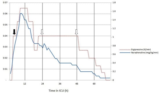 Vaspressor doses in the first 72 h of ICU treatment (solid arrow represents the start of cytokine removal and empty arrows represent the timepoints of hemadsorption membrane changes).