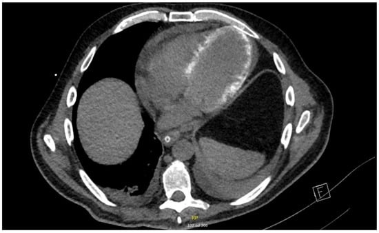 The results of additional investigations that were performed during the resolution phase of disease showed signs consistent with a septic cardiomiopathy. On cardiac CT performed on day 20 in the ICU, a hemodynamically unremarkable pericardial effusion (maximal diameter of 16 mm) and diffuse myocardial calcinations were observed (Figure 2).