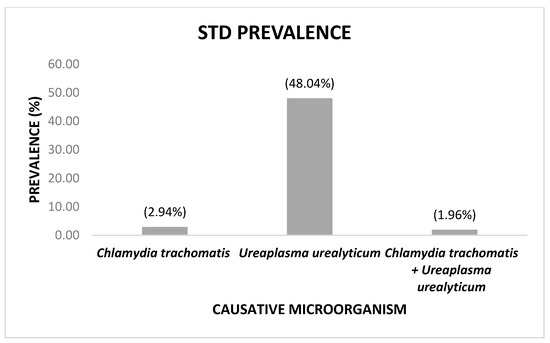 In the current study, it was found that 49.02% of the recruited patients were infected with an STD caused by at least one pathogen. The most prevalent causative agent was UU (48.04%), followed by CT (2.94%), and no cases of NG infection were reported (0%). Additionally, only 1.96% of the participants presented with co-infections with CT and UU.