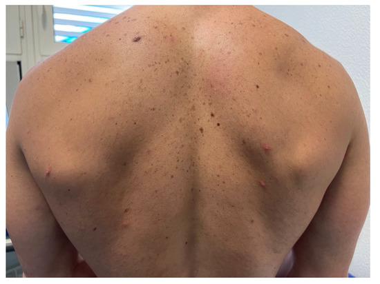 - Català, A.; Clavo Escribano, P.; Riera, J.; Martín-Ezquerra, G.; Fernandez-Gonzalez, P.; Revelles-Peñas, L.; Simon-Gozalbo, A.; Rodríguez-Cuadrado, F.J.; Castells, V.G.; de la Torre Gomar, F.J.; et al. Monkeypox outbreak in Spain: Clinical and epidemiological findings in a prospective cross-sectional study of 185 cases. Br. J. Dermatol. 2022. online ahead of print. Available online: https://pubmed.ncbi.nlm.nih.gov/35917191/ (accessed on 10 August 2022). [CrossRef] [PubMed]