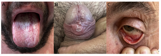 Skin lesions were noted in all patients (Figure 1). The most common anatomical affected sites were the genital area (63.8%; n = 30) (Figure 2A), the anorectal area (46.8%, n = 22); the trunk, arms or legs (44.7%; n = 21); and the face (27.7%; n = 13) (Figure S1). One person presented with a singular genital ulcer. Of the total patients observed, only two had more than 20 lesions at the time of observation, one of them in a disseminated pattern. Anorectal mucosa involvement was reported to be associated with anorectal pain, proctitis, or anal mucus discharge (or a combination of these symptoms). Extra anogenital mucosal involvement was present in three patients with oral erosions (Figure 2B) and one with conjunctival mucosal involvement (Figure 2C).