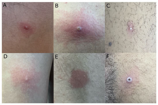 Typical skin findings included erythematous papules and whitish papules (Figure 3 and Figure S2). Umbilicated papules were also common, some with a necrotic center and an elevated whitish border (Figure 3F). Oral mucosa ulcers presented with well-defined borders and a clean base (Figure 2B). Most patients had lesions in multiple phases presenting simultaneously.