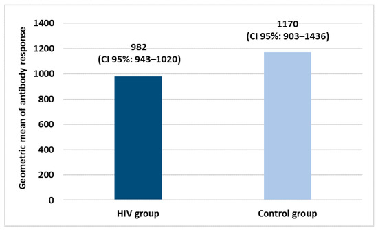 Both groups received two doses of COVID-19 vaccination. Specifically, in the HIV+ group, 84.3% of subjects were vaccinated with BNT162b2 COVID-19 mRNA (Pfizer/Biontech), 8.4% with ChAdOx1-nCoV-19 (AstraZeneca) and 3.6% with NIAID’s mRNA-1273 (Moderna). All the subjects belonging to the control group were vaccinated with BNT162b2 COVID-19 mRNA (Pfizer/Biontech). Figure 1 shows the geometric mean of the antibody response in both study groups.