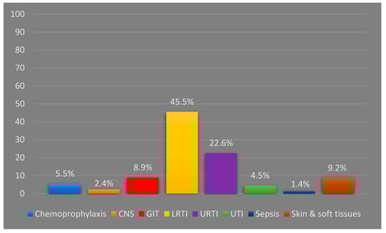 In Malaysia, respiratory tract infections were also reported as the primary driver for caregivers to bring their children to the emergency department [] and primary care clinics, where more than 35% of the patients received at least one antibiotic []. Limited data are available about antibiotic use in pediatric wards in Malaysia. A one-month study that reported the results from a tertiary hospital in Malaysia also found that respiratory tract infections were the leading cause of antibiotic use. However, the appropriateness of the prescribed antibiotics was reported to be 99.8% []. It is worth noting here that a review of the Malaysian ADR reporting system revealed that systemic anti-infective agents were the most common therapeutic group reported for ADRs in pediatric patients []. To the best of the authors’ knowledge, there are no studies evaluating the appropriateness of antibiotic prescribing among hospitalized pediatric patients in Malaysia. The objective of this study is to assess the indication, prescribing pattern and appropriateness of antibiotics that are prescribed for hospitalized pediatric patients.