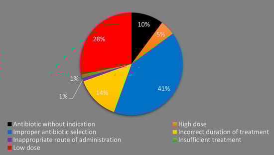 The national antibiotic guidelines (NAG) of 2014 and 2019 [,] were used to assess the appropriateness of the prescribed antibiotics. Antibiotic prescribing was deemed inappropriate if the antibiotic was unnecessary prescribed for a viral infection or if the selection, dose, duration of treatment or route of administration did not adhere to the NAG. The selection of antibiotic was considered improper if it was not listed in the NAG as one of the recommended or alternative options for a particular infection. Antibiotic dosage was assessed based on the total daily dose. When an infectious condition was not found in the NAG, Uptodate® was used as a reference. Therefore, the types of IAP investigated in this study were antibiotic without indication, improper antibiotic selection, inappropriate route of administration, low dose, high dose, incorrect duration of treatment and insufficient treatment where two antibiotics are indicated but only one was given.
