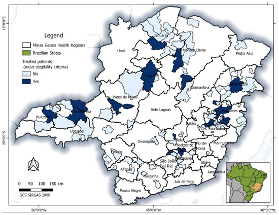 Geospatial location of treated CHB patients by health regions in the Minas Gerais state (Brazil), according to the eligibility criteria defined in the “Clinical Protocol and Therapeutic Guidelines for the Treatment of Chronic B Viral Hepatitis and Coinfections”, from May 2012 to September 2013, using QGIS software.