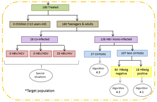 Focusing on the application of the CPTG-CHB guidelines, in 111 forms (91.7%) there was a positive sign of adoption by most physicians (44/63; 69.8%) responsible for patients’ therapeutic conduct. On the other hand, 10 of them (8.3%) were unaware of their existence or did not adhere to this tool. This adherence rate was not confirmed after comparisons between the clinical–laboratory data of treated patients and the therapeutic recommendations established in the CPTG-CHB. Of the 180 treated patients, only 71 (39.4%) met the criteria established for antiviral therapy indication; therefore, they were considered “truly” eligible according to this guideline (Table 1). The distribution of treatment-eligible CHB patients, according to the algorithms and special situations recommended in the CPTG-CHB, are shown in Figure 3 and Figure 4. In the 109 remaining patients (72.7%), the hepatic markers described in the forms did not justify the prompt introduction of antiviral therapy.