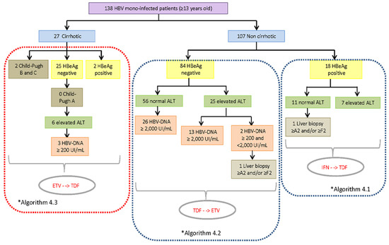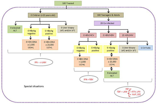 Distribution of treated CHB patients, classified as a special situation, eligible for antiviral therapy, according to the algorithms “Clinical Protocol and Therapeutic Guidelines for the Treatment of Chronic Viral Hepatitis B and Coinfections” (version 2011) and evaluated from May 2012 to September 2013 at the Central Laboratory of Public Health of Minas Gerais (Brazil). Legend: ALT, Alanine aminotransferase; DNA, Deoxyribonucleic acid; EFZ, Efanvirez; ETV, Entecavir; HBV, Hepatitis B virus; HBeAg, Hepatitis B virus “e” antigen; HCV, Hepatitis C virus; HDV, Hepatitis Delta virus; HIV, Human Immunodeficiency virus; IFN, Interferon; LAM, Lamivudine; LPV, Lopinavir, RBV, Ribavirin; RTV, Ritonavir; and TDF, Tenofovir. The number of individuals differs from the total due to a lack of data.