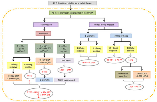 Flowchart of the disposition of treated CHB patients according to the therapeutic medication provided in the “Clinical Protocol and Therapeutic Guidelines for the Treatment of Chronic Viral Hepatitis B and Coinfections” (version 2011), Brazil. Legend: DNA, Deoxyribonucleic acid; EFZ, Efanvirez; ETV, Entecavir; HBV, Hepatitis B virus; HBeAg, Hepatitis B virus “e” antigen; HIV, Human Immunodeficiency virus; LAM, Lamivudine; LPV, Lopinavir, Lt CD4+, T-lymphocytes subsets CD4+; NVP, Nevirapine; RTV, Ritonavir; TARV, antiretroviral therapy; and TDF, Tenofovir. The number of individuals differs from the total due to a lack of data.
