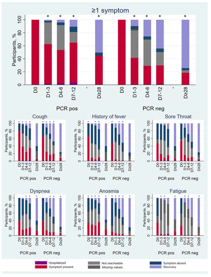 Proportion of patients reporting of specific symptoms over time by SARS-CoV-2 RT-PCR test results. * = p < 0.05; p-value of chi-square test comparing symptomatic versus asymptomatic or recovered patients at each visit, not including missing, not reachable, and admitted cases. COVID-AMBU study, Switzerland, March–July 2020.