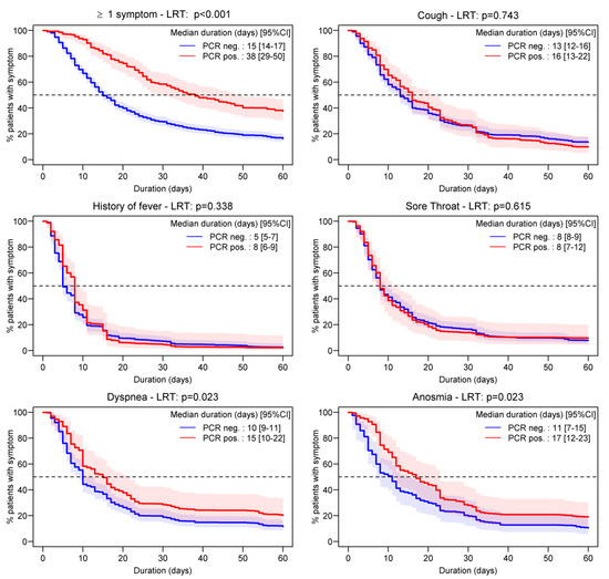 The Kaplan–Meier analysis that included the imputed RT-PCR result estimated a median time to symptom recovery of 38 days (95% CI 29–50) among RT-PCR-positive patients, and 15 days (95% CI 14–17) among RT-PCR-negative patients (Figure 3). Specific symptoms that lasted longer among RT-PCR-positive patients compared to negative patients were hypo/anosmia and dyspnea, with median durations of 17 (95%CI 12–23) and 15 days (95%CI 10–22), respectively.