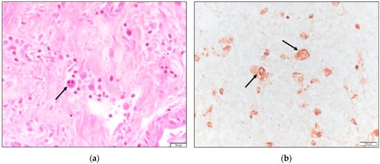 Other autopsy findings included acute pneumonia; bilateral pulmonary edema; a focal pulmonary infarct of the left lower lobe, emphysema, pulmonary hypertension; cardiomegaly; serous pleural and pericardial effusions; mild hepatic steatosis and centrilobular congestion; splenomegaly with congestion (300 g; average adult female spleen weight = 115 g (SD ± 51 g) []); and kidneys with mild global glomerulosclerosis, interstitial fibrosis, and mild arteriolonephrosclerosis. The brain showed age-related tauopathy but lacked the neuronal necrosis with focal perivascular mononuclear cell infiltrate (glial or typhus nodule) indicative of rickettsial encephalitis []. Although the patient was suspected to have pancreatitis based on the elevated lipase level, the pancreas was grossly normal at autopsy (a histopathologic exam was not performed). It is likely that FBT also induced the pulmonary infarction, as suggested by the high d-dimer levels.