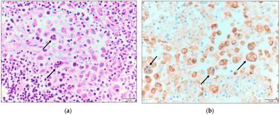 (a) Mediastinal lymph node with non-neoplastic activated histiocytes that exhibit hemophagocytosis (H&E, 400×); (b) CD68 immunohistochemical stain demonstrates hemophagocytotic histiocytes containing small lymphocytes in a mediastinal lymph node (CD68, 400×).