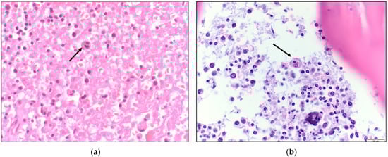 (a) Histiocytes engulfing small lymphocytes in the spleen (H&E, 400×; (b) Bone marrow infiltration by non-neoplastic histiocytes that display hemophagocytosis (H&E, 400×).