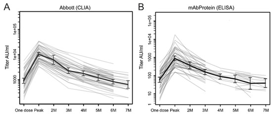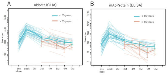 | Timing of Blood Sampling after the Second Dose | n | Abbott (CLIA) | mAbProtein (ELISA) | ||