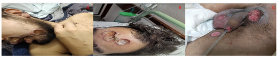 On examination, the patient had fever with an axillary temperature of 38.0 ºC; most of the cutaneous lesions had an umbilicated necrotic center or were ulcerated with a purulent exudate. The most severe ulcers in size (>2 cm diameter) and depth were located in the right genian region, penile gland and urinary meatus, scrotum, anal, and perianal region, with erosion of mucosa and submucosa and erythematous regular border. He complained of severe pain caused by anal and perianal ulcers. Lesion exudate samples were collected for mpox virus polymerase chain reaction (PCR), empirical oral antibiotics were started for probable bacterial coinfection, and the patient was discharged home. Upon reevaluation on day +9 as an outpatient, and by then with confirmation of positive PCR result for mpox, the patient was hospitalized in an internal medicine ward due to complicated mpox with insufficient pain management; progressive worsening of muco-cutaneous mpox lesions in number, size, depth, and exudation with presumptive bacterial superinfection (