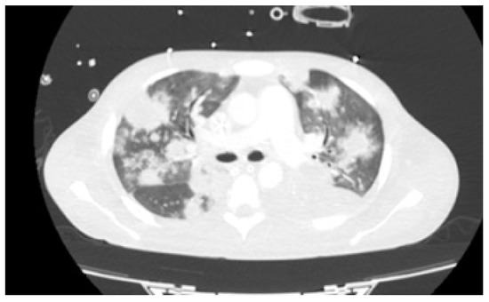 As fever, hypoxemia and raising of inflammatory parameters persisted without any additional agent identification, and after 41 days of empirical antibiotics, thoracic CT was repeated on day +43 (