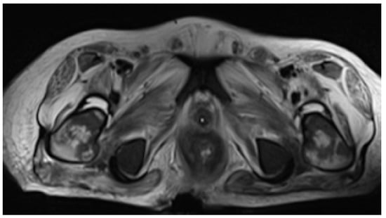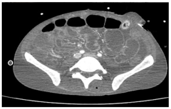Empirical endovenous ganciclovir was initiated at admission, admitting simultaneous interplay of CMV colitis considering the presentation with diarrhea with bloody stool and previous history of CMV gastrointestinal disease. The high clinical suspicion and the late access to the result of negative CMV viral load justified that this therapy was carried out until day +30. Despite this antiviral empirical therapy and maintaining broad-spectrum parenteral antibiotic coverage (from day 0 to day +41), the patient maintained bloody diarrhea. Abdominopelvic computed tomography (CT) was performed on days +12 and +24, showing parietal thickening of the distal rectum and anus and marked diffuse densification in all the adipose planes of the perineum and buttocks as well as an area suggestive of a periluminal abscess in that region.