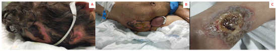 Figure 4A–C). The ulcers documented at admission continued to progress in size and depth, being the most remarkable on the scalp (with epicranial aponeurosis exposure) and anal-gluteal-sacral region, with which, despite protective colostomy, there was further tissue destruction with rectal fistulization to the skin, which was evident on pelvic MRI on day +97 (