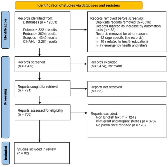 We imported 12,851 references for screening. We screened 4265 unduplicated references, from which 791 were identified for full-text review and included 82 studies ([,,,,,,,,,,,,,,,,,,,,,,,,,,,,,,,,,,,,,,,,,,,,,,,,,,,,,,,,,,,,,,,,,,,,,,,,,,,,,,,,]) (Figure 1).