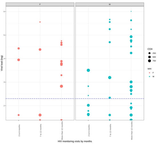Figure 2. Samples were grouped by months according to HIV-1 monitoring visits and divided into males and females on the figure. The size of the dot represents the CD4+ T lymphocyte count, and the dashed line in blue shows 200 copies/mL. Of 22 subjects with VF, 16 were men (72.7%), and 6 were women (27.3%). No marked difference was shown in CD4+ T count between female and male subjects, showing values < 500 copies/mL throughout follow-up. Comparing HIV-1 viral load levels versus gender, the proportion of females failing to reach viral suppression was more significant than men, with a p-value of 0.006.