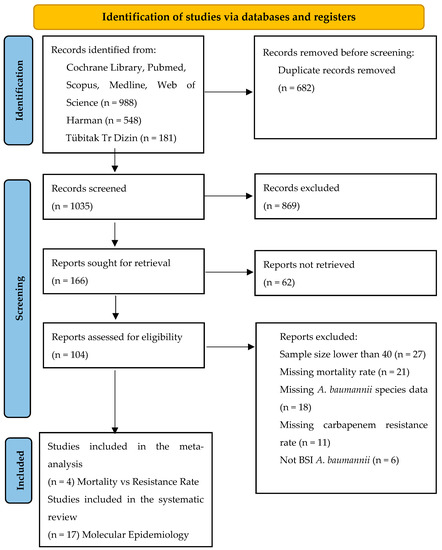 Bloodstream infections caused by A. baumannii remain as major threat to healthcare [35]. In this systematic review and meta-analysis, we screened a total of 1456 patients with carbapenem-resistant A. baumannii bloodstream infections within the years of 2007 to 2018 from the published literature between 2003 and 2023. We selected four articles for the meta-analysis of the A. baumannii BSI mortality rate in response to an increasing carbapenem resistance rate (Figure 1). For the evaluation on a molecular epidemiology basis, 17 articles were selected for the systematic review on the diversity and distribution of carbapenemase genes encoded by CRAB in Türkiye.
