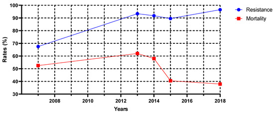 Corresponding carbapenem resistance and case fatality rates of A. baumannii between the years of 2007 and 2018.