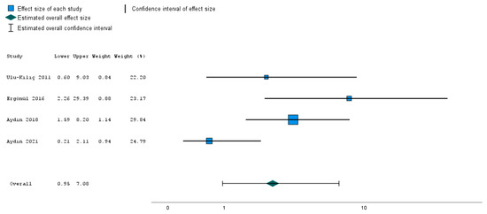 The Newcastle–Ottawa Quality Assessment Scale (NOS) for Cohort Studies [12] was selected to evaluate the bias of selected articles by the authors J.B. and F.P. NOS was selected based on its suitability to assess the quality of non-randomized studies in systematic review and meta-analysis studies. All selected articles scored 7 points, which is considered a high-quality study (Table 1). Three out of 4 articles [11,13,14] lost score points due to being retrospective studies, and the remaining article lost a score point due to the poor comparability of cohorts in the design and analysis of the study [10].