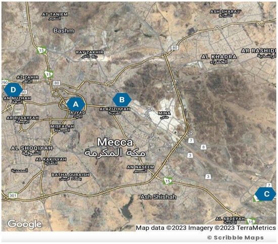 Sampling site location map adapted from Map Data, TerraMetrics 2023; Blue circles show site locations as follows: Circle A: Al-Haram; Circle B: Al-Aziziyah; Circle C: Arafat; Circle D: Al-Nuzhah.