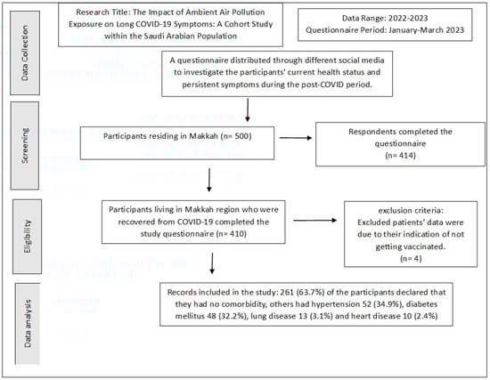This research examined individuals who recuperated from COVID-19 between 2022 and 2023. Only individuals with a confirmed diagnosis of COVID-19, as evidenced by a positive SARS-CoV-2 PCR test result from accredited testing facilities, were considered. This criterion ensured the authenticity of the COVID-19 infection among participants. Individuals who had been hospitalized due to severe COVID-19 symptoms were noted but not excluded, allowing for the study to capture a range of disease severities. However, we excluded those with critical comorbidities or those who were immunocompromised in order to prevent potential confounding. To qualify, participants were required to have fully recovered from their acute COVID-19 symptoms for at least three months, ensuring that the study was genuinely capturing the persistence of long COVID symptoms rather than acute post-infection symptoms. Individuals who had experienced more than one confirmed episode of COVID-19 were excluded to ensure clarity in associating air pollution exposure with symptom persistence from a single infection event. To gauge the prevalence of lingering COVID symptoms, we devised a survey to probe their current health and any ongoing post-COVID symptoms. Between January and March 2023, this survey was propagated across various digital media platforms. All respondents were mandated to give their informed consent before participating. The investigative protocol was greenlit by the Ethical Committee Board at the Faculty of Medicine, Umm Al-Qura University, under the reference (Approval no. HAPO-02-K-012-2022-01-902), thus adhering to the standards set by the Saudi National Committee for Bioethics HABO-02-K-012.