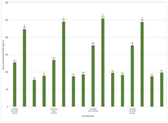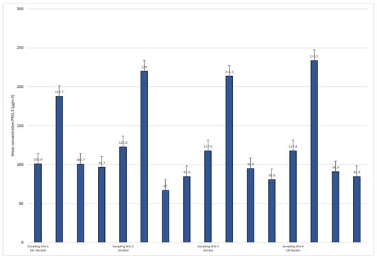 Figure 4 and Figure 5 display the concentrations of PM10 and PM2.5 (particulate matter with diameters less than or equal to 10 µm and 2.5 µm, respectively) at different sampling sites during four rounds of sampling. The sampling sites are identified as Site-1 (Al-Haram), Site-2 (Arafat), Site-3 (Azizia), and Site-4 (Al Nuzah). The measurements were taken over four seasons: spring, summer, autumn, and winter. Each round of sampling lasted for a specific duration (9 weeks for spring, 10 weeks for summer, 8 weeks for autumn, and 10 weeks for winter).