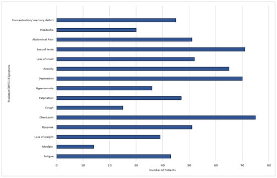 Among the study participants, 150 individuals (63.5%) experienced persistent symptoms. It is noteworthy that all the participants received at least two doses of the vaccine. Of those who had symptoms, more than half reported having two or more symptoms. The most common systemic symptoms reported were fatigue (29%), headache (20%), and myalgia (9.5%). In terms of respiratory symptoms, cough, wheezing, and chest pain were the most prevalent, with a total of 62 individuals (41.5%) experiencing these symptoms persistently. Around 38 participants (25.4%) reported having continuous symptoms as well as neuropsychiatric manifestations. These included concentration or memory deficits (16.7%) and headaches (9.9%). Anxiety and depression were reported by 15 individuals (10.2%) and 14 individuals (9.5%), respectively. Hair loss was another recurrent dermatological symptom reported by 11.5% of the patients. On the other hand, approximately 260 individuals (63.4%) did not report any of the aforementioned post-recovery symptoms, as illustrated in Figure 6.