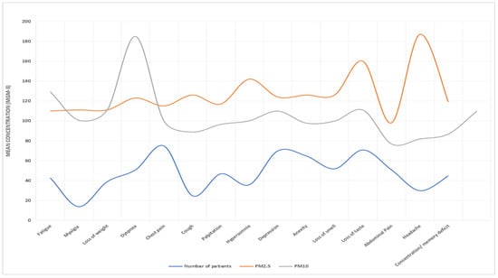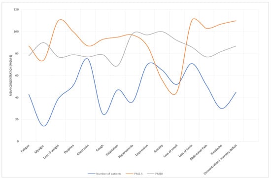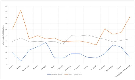 Furthermore, an analysis using data from the COVID Symptom Study app found that higher levels of air pollution, particularly PM2.5 and nitrogen oxides (NOx), were associated with an increased risk of long COVID symptoms, including fatigue, a cough, and anosmia []. Similarly, a study by in the United States observed a significant association between exposure to PM2.5 and increased odds of long COVID symptoms, particularly fatigue, shortness of breath, and impaired smell and taste []. The association between air pollution exposure and long COVID symptoms can be attributed to several mechanisms []. Air pollutants, such as PM2.5 and NO2, have been shown to induce oxidative stress, inflammation, and respiratory damage, each of which can exacerbate the effects of SARS-CoV-2 infection and prolong the recovery process [,]. Furthermore, air pollution can impair immune function and respiratory health, making individuals more susceptible to persistent symptoms following COVID-19 [].