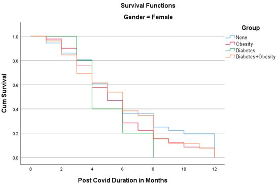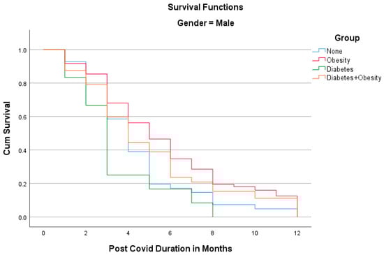 The Kaplan–Meier analyses shown in Figure 1 and Figure 2 reveal the surprising fact that both males and females with diabetes had the shortest PCS durations; in other words, all patients recovered within 8 months. Other groups had longer PCS durations, meaning that after the 12th month, some patients still did not recover, namely 13.1% in the Obesity group, 12.5% in the Diabetes + Obesity group, and 4.6% in the None group. The mean recovery times were 5.3 3.2 in the None group, 5.7 in the Obesity group, 3.9in the Diabetes group, and 5.28 ± 3.3 in the Diabetes + Obesity group.