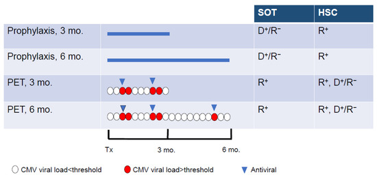 Strategies used for the prevention of CMV infection in solid organ transplant (SOT) and hematopoietic stem cell (HSC) recipients. Universal prophylaxis is based on the administration of antivirals (blue line) to all at-risk patients for 3 or 6 months after transplantation (Tx). During pre-emptive therapy (PET), the antiviral (blue triangle) is administered when the viral load (determined in blood every week for 3 or 6 months) is higher than a defined threshold (red circle) and stopped when the viral is below the threshold (white circle). D+/R−, donor positive/recipient negative for CMV; R+, recipient positive for CMV. Adapted from Limaye et al. [5].