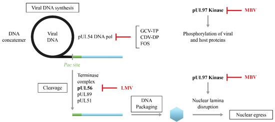 LMV is a dihydroxyquinazoline derivative (Figure 1) that demonstrates in vitro activity against CMV with an EC50 value in the nanomolar range but it is not active against other herpesviruses [70,71]. LMV is a specific inhibitor of the CMV terminase complex and shows activity against isolates resistant to DNA polymerase inhibitors [66,71,72]. LMV interferes with the cleavage of the viral DNA and its packaging into capsids (Figure 4) [66].