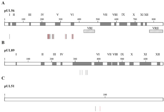 Confirmed amino acid changes associated with resistance to letermovir detected in CMV laboratory strains and clinical specimens. Panel (A) shows amino acid substitutions in the pUL56 subunit associated with letermovir resistance (vertical bars). Grey boxes represent the conserved regions of pUL56, which are numbered I to XII. Hatched boxes represent the two variable regions, which are labeled as VRI and VRII. Panel (B) shows amino acid substitutions in the pUL89 subunit conferring resistance to letermovir (vertical bars). Grey boxes represent the conserved regions in pUL89, which are numbered I to XII. Panel (C) shows amino acid substitutions in pUL51 subunit conferring letermovir resistance (vertical bars). In all panels, vertical bars show amino acid substitutions associated with letermovir resistance identified in laboratory strains (black) and clinical specimens (red).