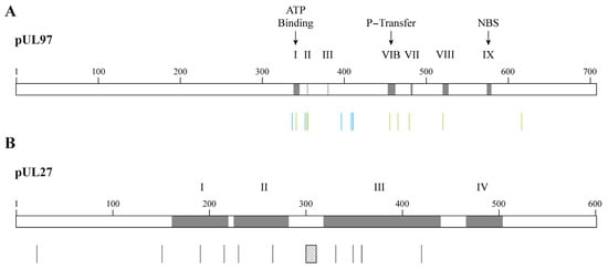 Confirmed amino acid changes associated with resistance to maribavir detected in CMV laboratory strains and clinical specimens. Panel (A) shows amino acid substitutions in the pUL97 kinase conferring CMV resistance to maribavir (vertical bars in blue) or to maribavir/ganciclovir (vertical bars in green). Grey boxes represent the ATP-binding site, the phosphate transfer (P-transfer) domain, the nucleoside-binding site (NBS) and some regions conserved among the protein kinase family (i.e., I, II, III, VIB, VII, VIII and IX). Panel (B) shows amino acid substitutions in the pUL27 associated with resistance to maribavir (vertical bars in black). The hatched box represents codons 301–311 deletion that confers maribavir resistance. Grey boxes represent the conserved regions in pUL27, which are numbered I to IV.